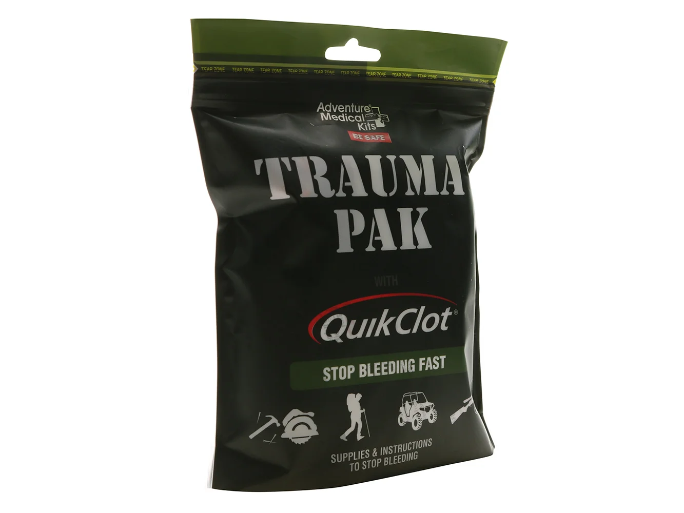 Packed in a tough, waterproof, pocket-sized pouch, the Trauma Pak with QuikClot® is easy to use: simply open, remove and apply. Also included is an information pamphlet on treating injuries.